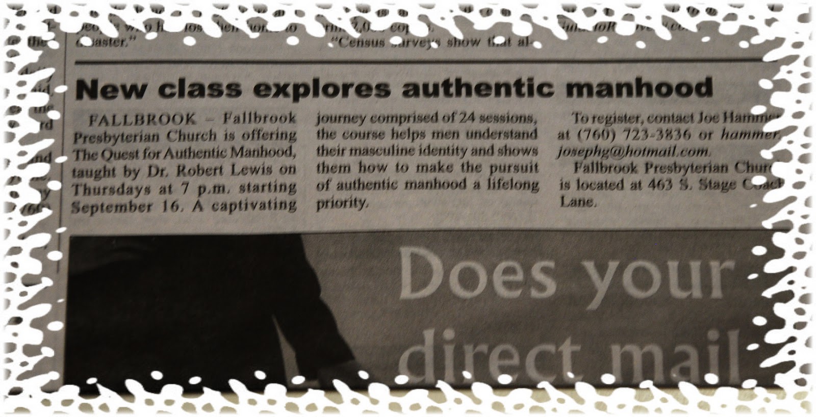I was perusing the local paper today and I see that they are having a workshop over at the Presbyterian Church on the topic of exploring your "authentic manhood". Now I am no homophobe but I can tell a gay come-on when I see one. Not to belabor this but if you have to go to church and get a sweaty hug from some guy in order to stay on the straight and narrow, let's just say that the loafers might already be a bit loose.